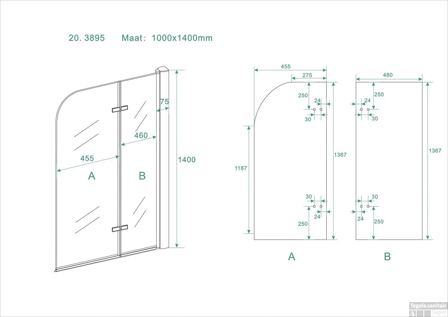 Badwand Wiesbaden inklapbaar 100x140cm 6mm NANO coating