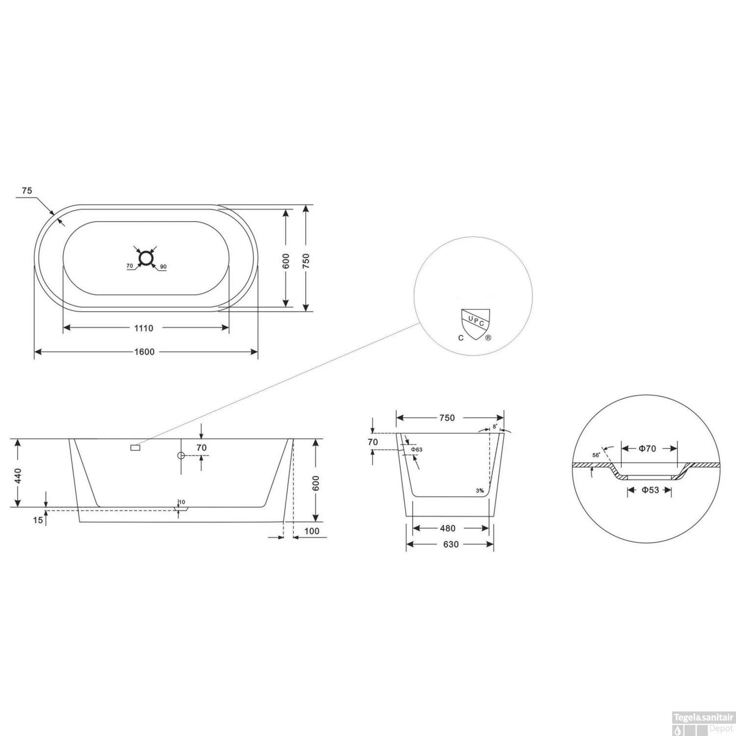 Specificaties Vrijstaand Ligbad Boss & Wessing Rondo 160x75x60cm Acryl Mat Wit: