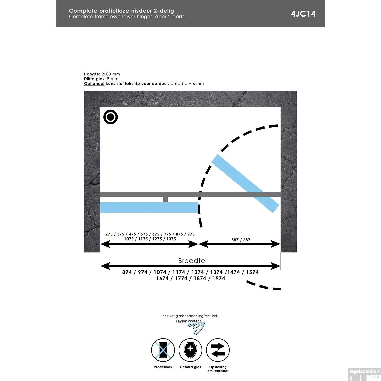 Verder heeft het glas een standaard hoogte van 200 cm, terwijl deze variant leverbaar is in zeven verschillende maten. Of u de deur links of rechtsdraaiend wilt, een inloopdouche, een u-opstelling, vrijwel alles is mogelijk binnen deze serie. U kunt zich laten adviseren over de mogelijkheden qua maatvoering.