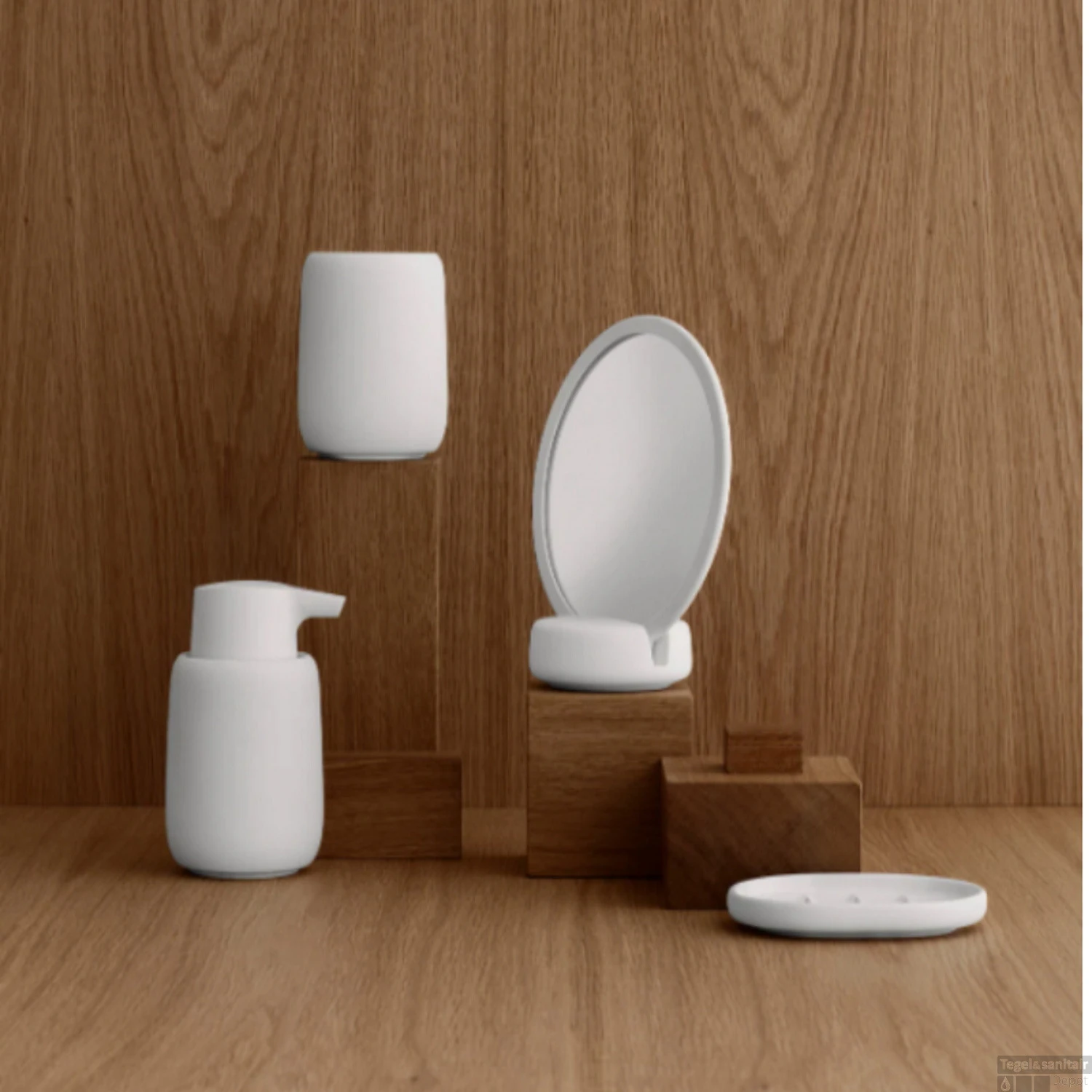 Deze fraaie witte cosmeticaspiegel van Blomus komt uit de Sono serie. De spiegel vergroot tot wel 5X. De spiegelranden zijn afgewerkt met een soft-touch hoes. Niet alleen geeft dit een chique uitstraling maar het geeft tevens een aangenaam gevoel. De spiegel is in meerdere kleuren verkrijgbaar. De hoogte is 8.5 cm, lengte 18.5 cm en de breedte is 17 cm.