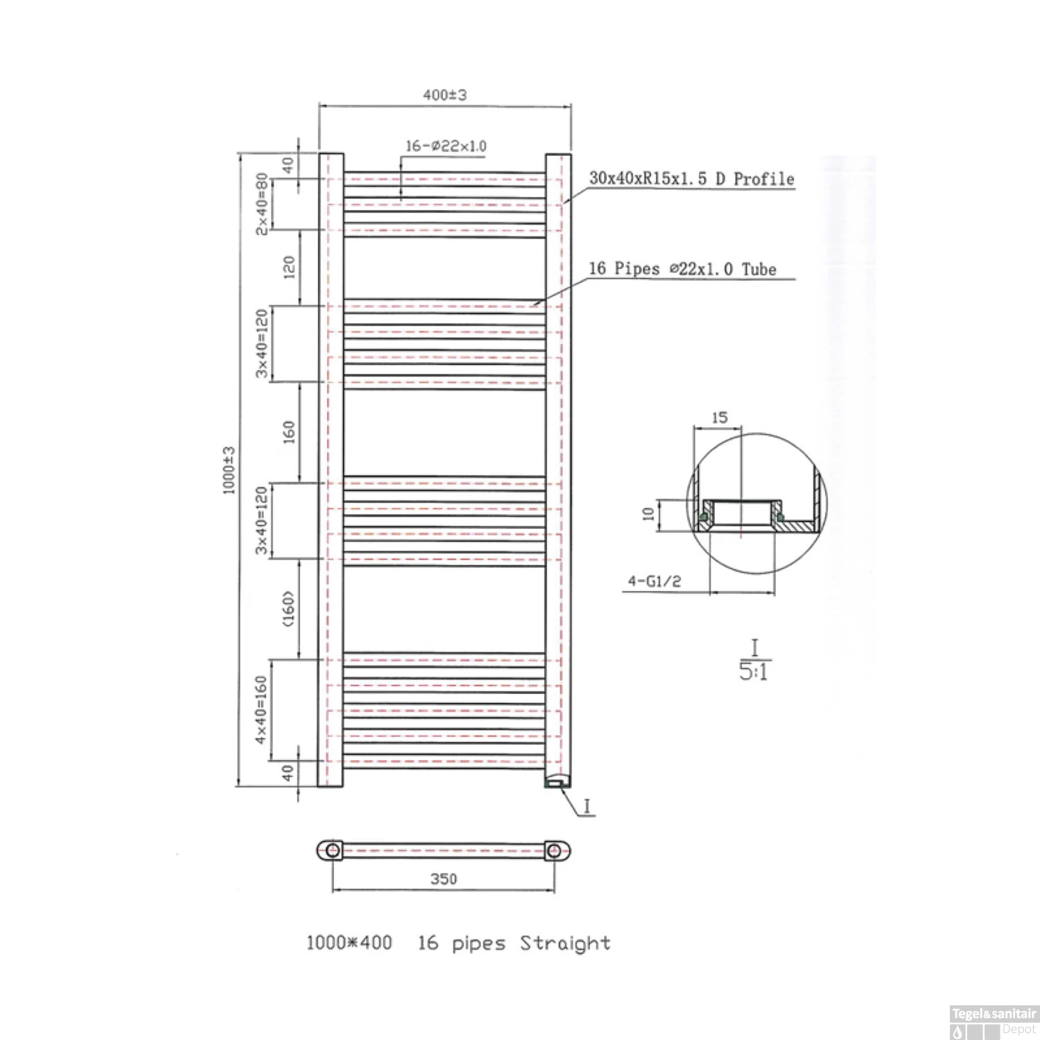 Specificaties Designradiator Boss & Wessing Vertico Multirail 100×40 cm Wit Zij-Onderaansluiting: