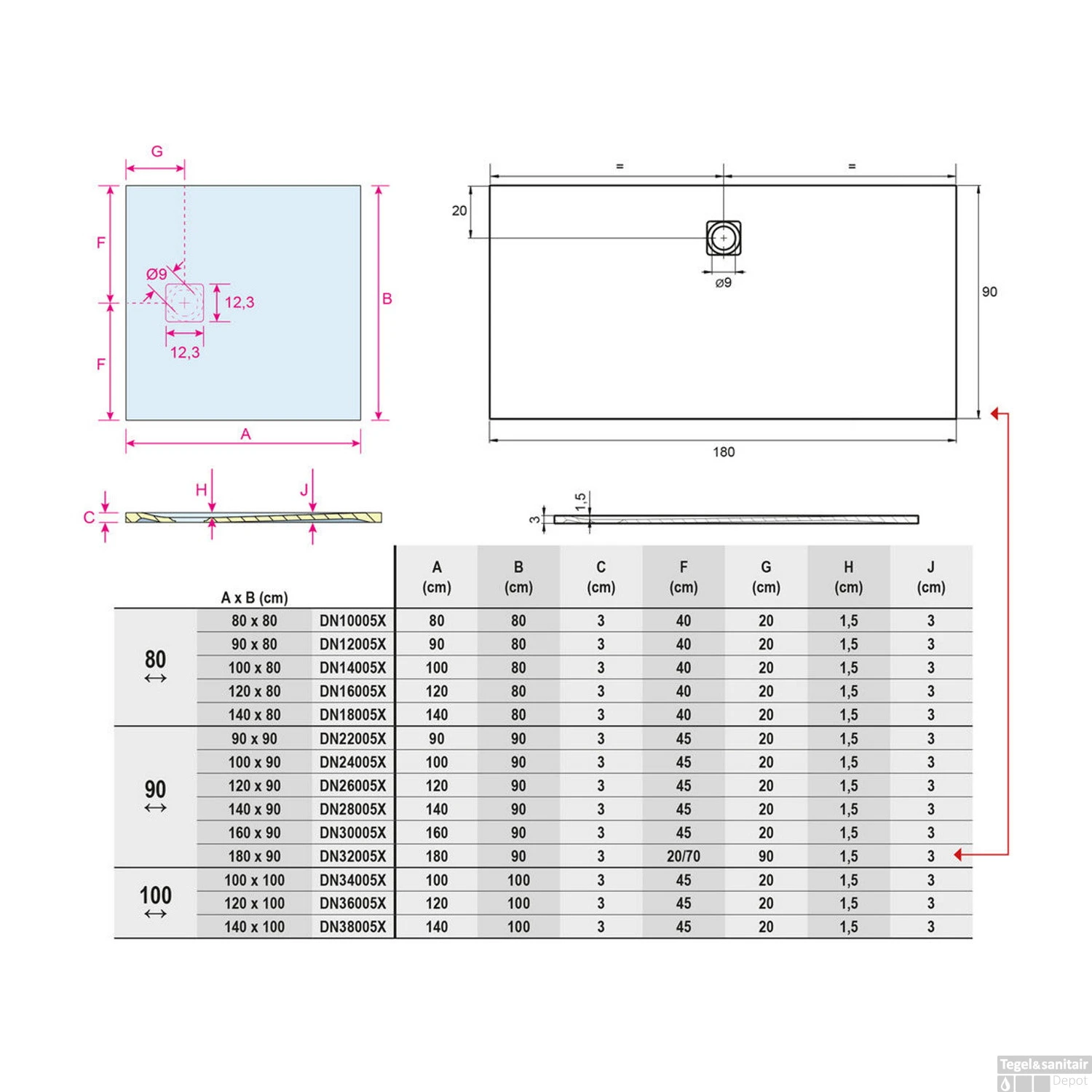 De afmetingen van deze douchebak zijn 100 cm breed en 90 cm diep. De douchebak is 3 cm hoog. Daarnaast is deze douchebak verkrijgbaar in 14 formaten van 80, 90 en 100 cm breed en tussen de 80 en 180 cm diep. Ook heeft u maar liefst 5 jaar (!) garantie op deze douchebak.