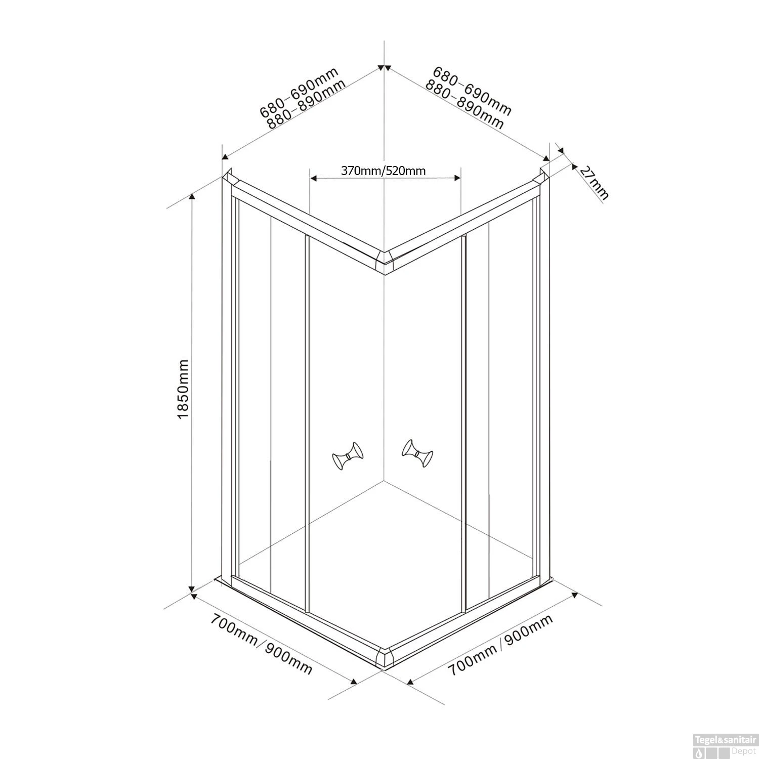 De douchecabine is 70 cm breed en 70 cm diep. Daarnaast is de cabine 185 cm hoog en heeft het profiel een witte kleur.