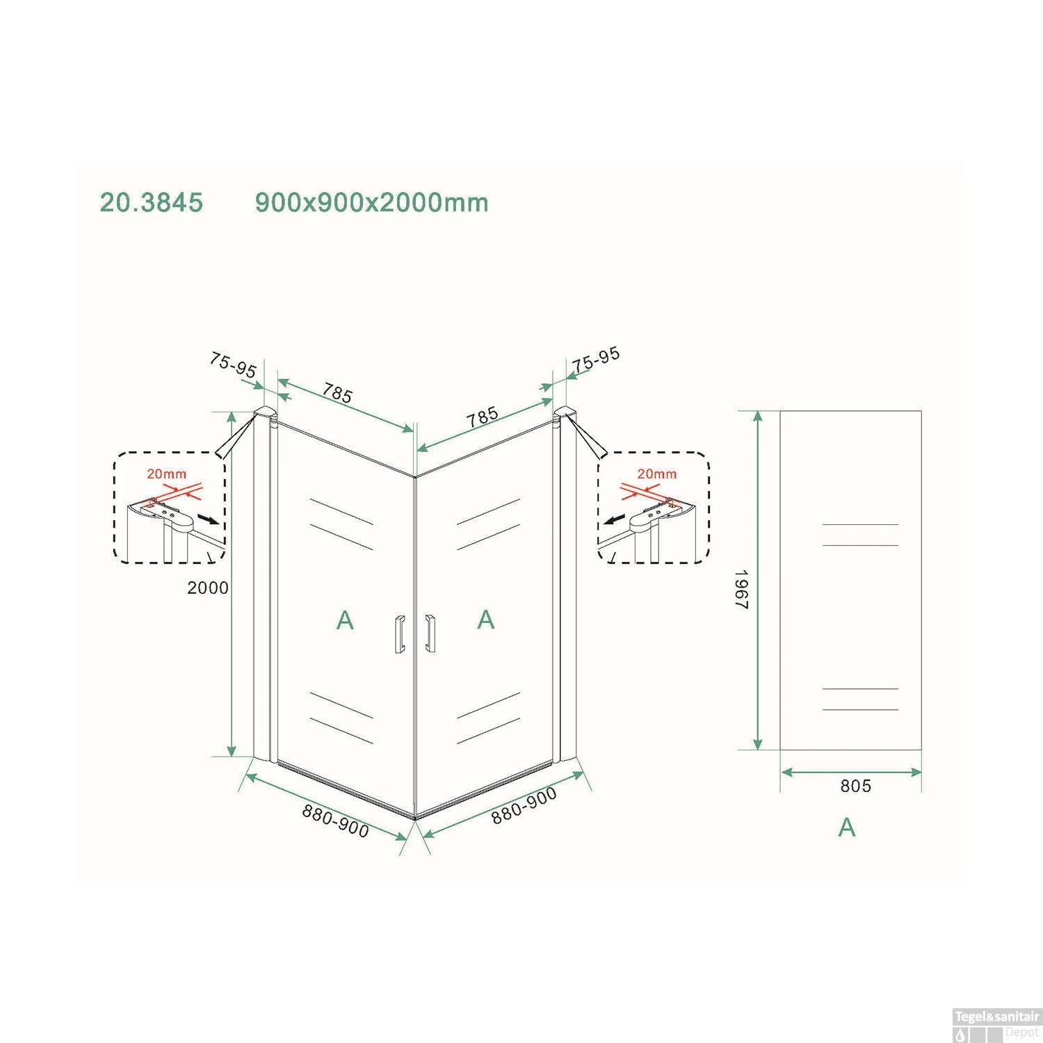 Douchecabine Wiesbaden dubbele swingdeur 90x90cm 8mm NANO coating
