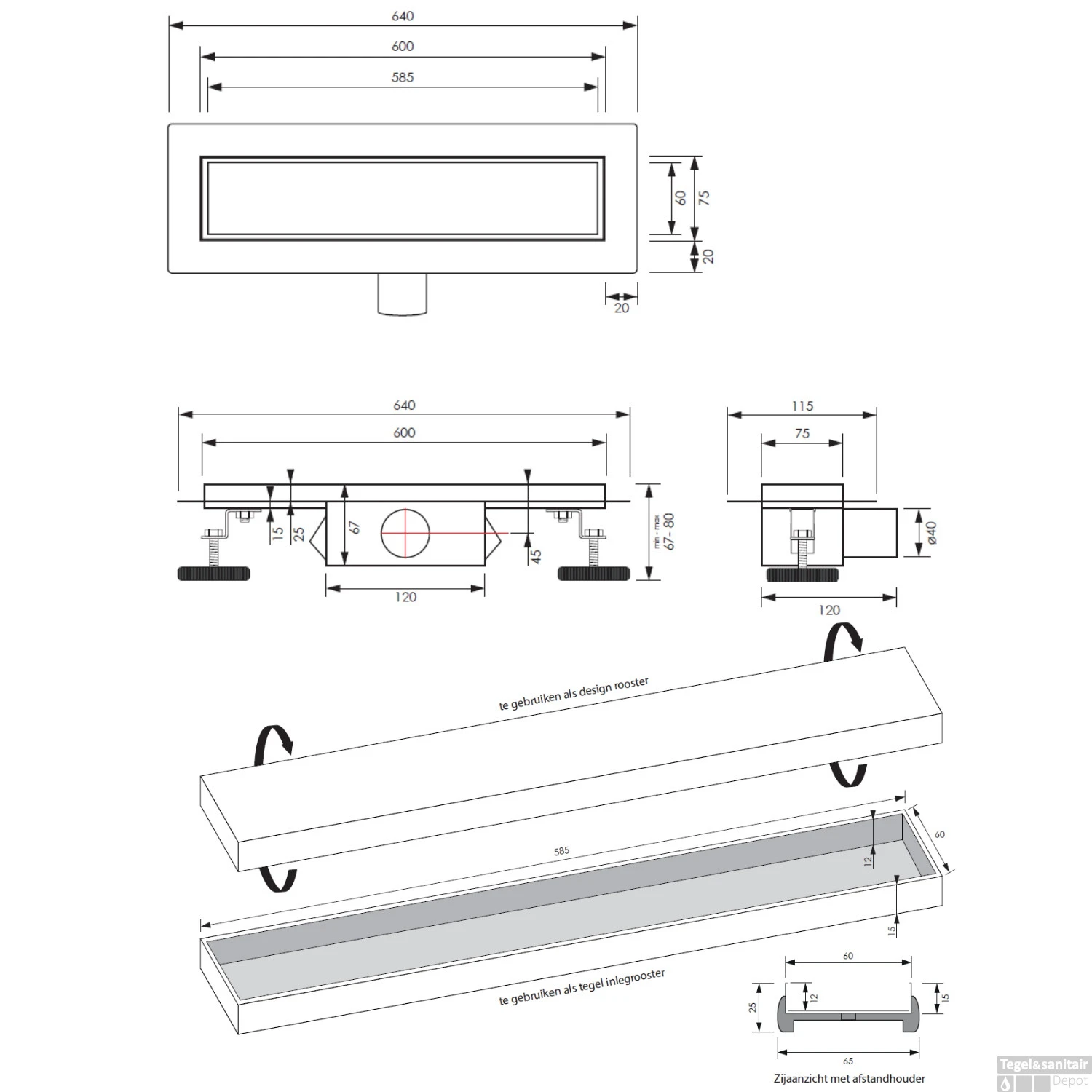 Specificaties Douchegoot Brauer Zero RVS Inclusief Vloerflens 60×7 cm Tegelinlegrooster Omkeerbaar