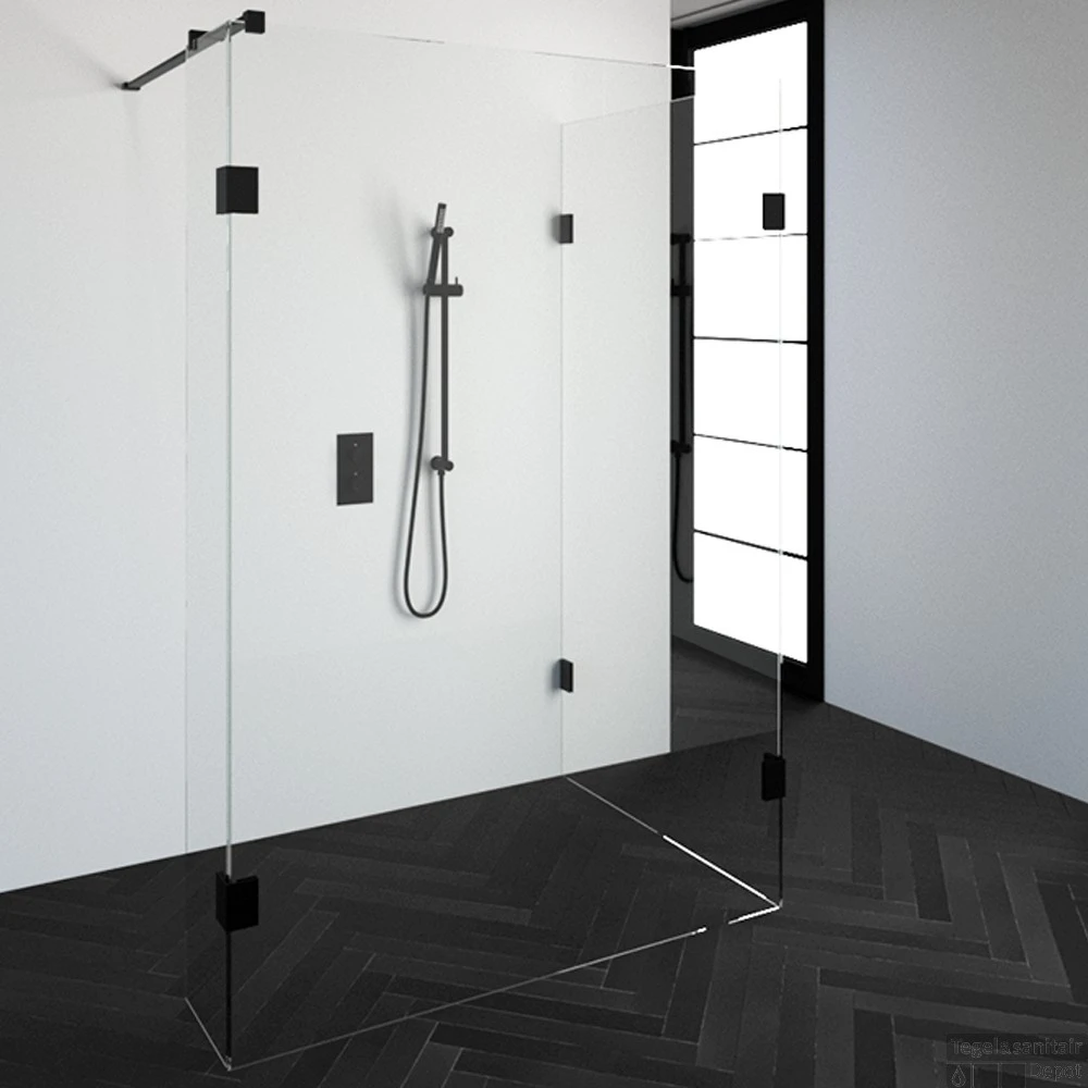 Deze complete inloopdouche bestaat uit twee inloopwanden en en een zijwand met Mat Zwart beslag. Inclusief glasbehandeling. De hoogte van de inloopdouche is 200 cm. Hij is 138,3 cm breed en 97,7 cm diep. Deze inloopdouche straalt luxe uit door zijn design en kleur.