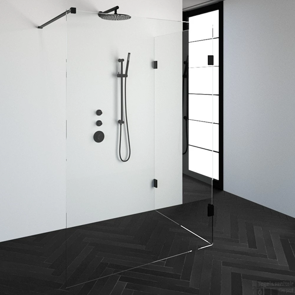 Deze complete inloopdouche bestaat uit twee inloopwanden met Mat Zwart beslag. Inclusief glasbehandeling. De hoogte van de inloopdouche is 200 cm. Hij is 138,3 cm breed en 97,7 cm diep. Deze inloopdouche straalt luxe uit door zijn design en kleur.