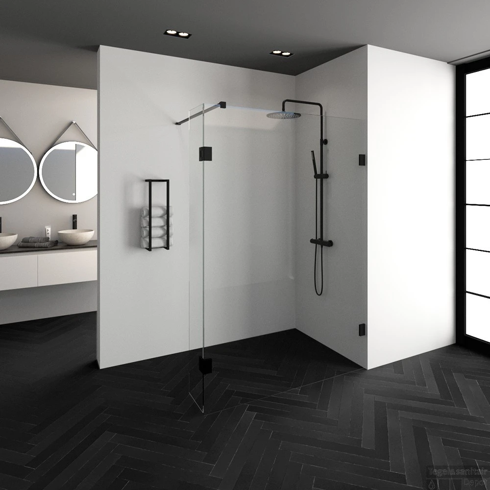 Deze complete inloopdouche bestaat uit een inloopwand en een draaibare zijwand met Mat Zwart beslag. Inclusief glasbehandeling en optionele kunststof profielen. De hoogte van de inloopdouche is 200 cm. Hij is 137,7 cm breed en maximaal 200 cm diep. Deze inloopdouche straalt luxe uit door zijn design en kleur.