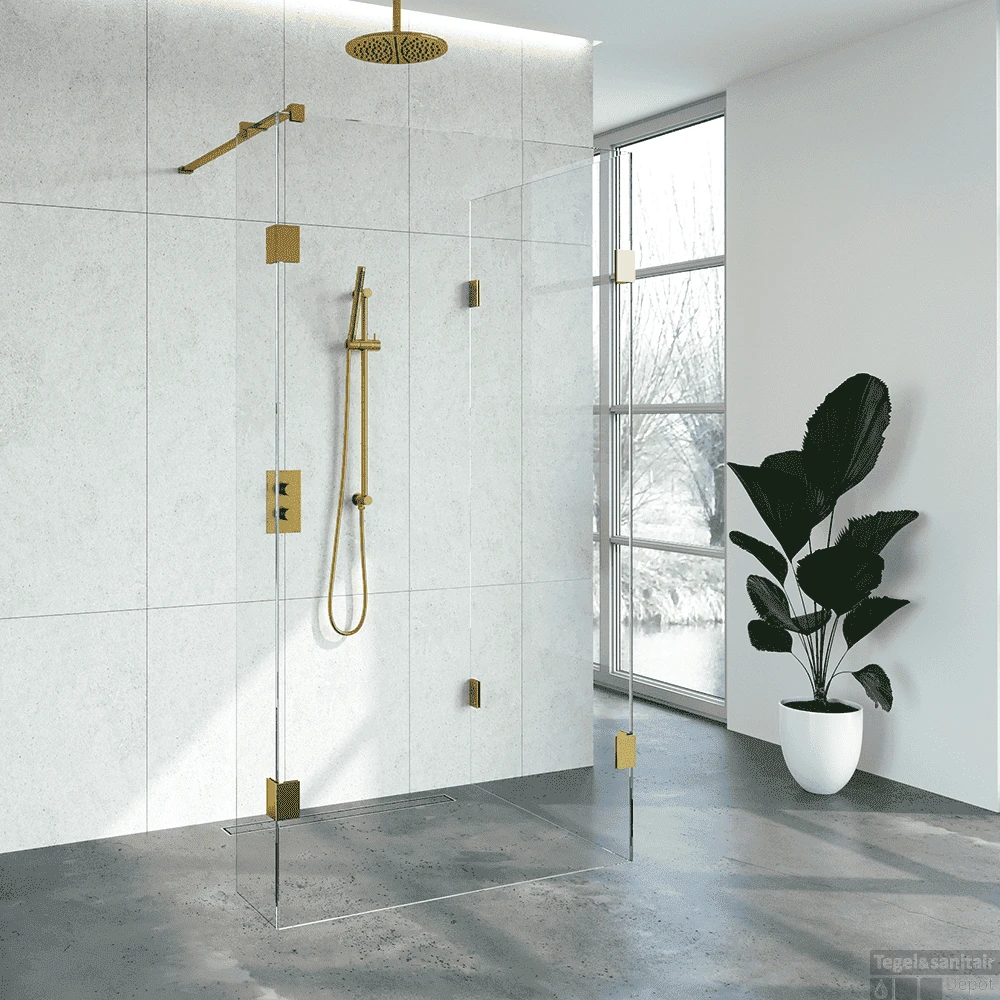 Deze complete inloopdouche bestaat uit twee inloopwanden en en een zijwand met Goud beslag. Inclusief glasbehandeling. De hoogte van de inloopdouche is 200 cm. Hij is 108,3 cm breed en 87,7 cm diep. Deze inloopdouche straalt luxe uit door zijn design en kleur.