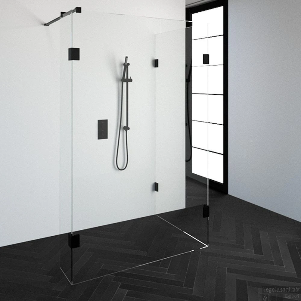 Deze complete inloopdouche bestaat uit twee inloopwanden en en een zijwand met Mat Zwart beslag. Inclusief glasbehandeling. De hoogte van de inloopdouche is 200 cm. Hij is 128,3 cm breed en 87,7 cm diep. Deze inloopdouche straalt luxe uit door zijn design en kleur.