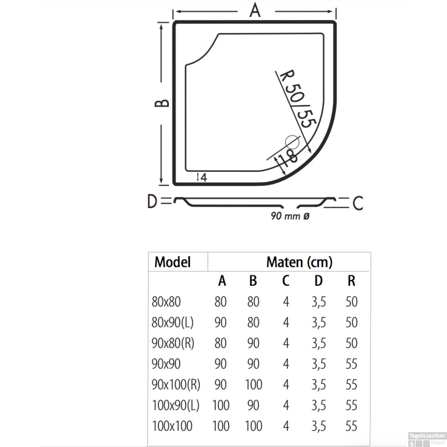 - Afmeting afvoergat: 90 mm
