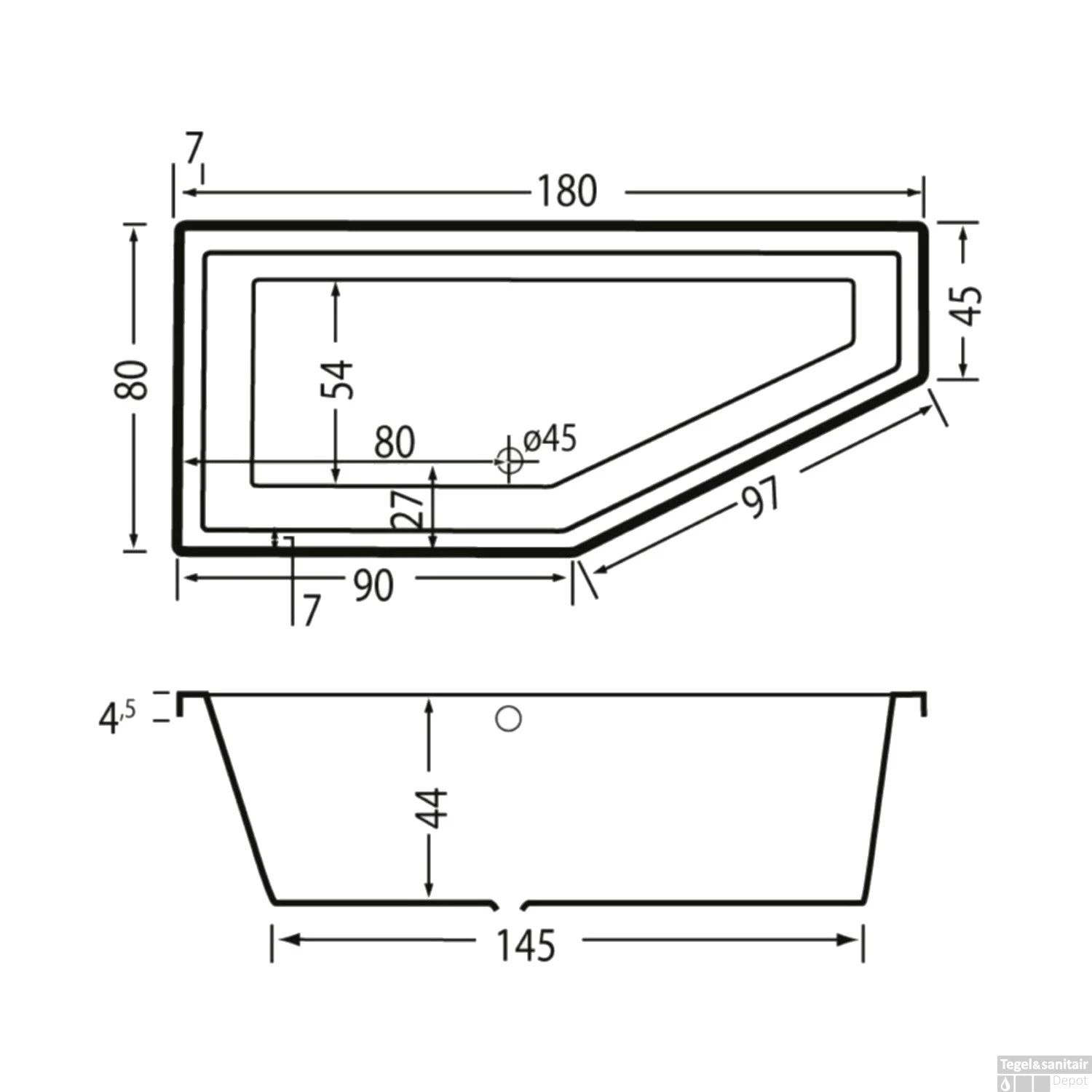 Dit moderne ligbad geeft een bijzonder fraaie uitstraling aan uw badkamer. Een ideaal bad om heerlijk in bij te komen na een drukke dag of om gewoon lekker in te relaxen. De vorm van dit ligbad geeft veel comfort en is makkelijk te onderhouden. Het bad is gemaakt van 100% hoogwaardige kwaliteit acryl en heeft een inhoud van 275 liter. Acryl is een soort kunststof dat warm aanvoelt, is poriënvrij en heeft een glad oppervlak. Als voordeel heeft acryl dat vuil en bacteriën zich nauwelijks hechten. Acryl is een kleurvast materiaal, wordt in verschillende vormen gegoten en houdt het water langer warm.