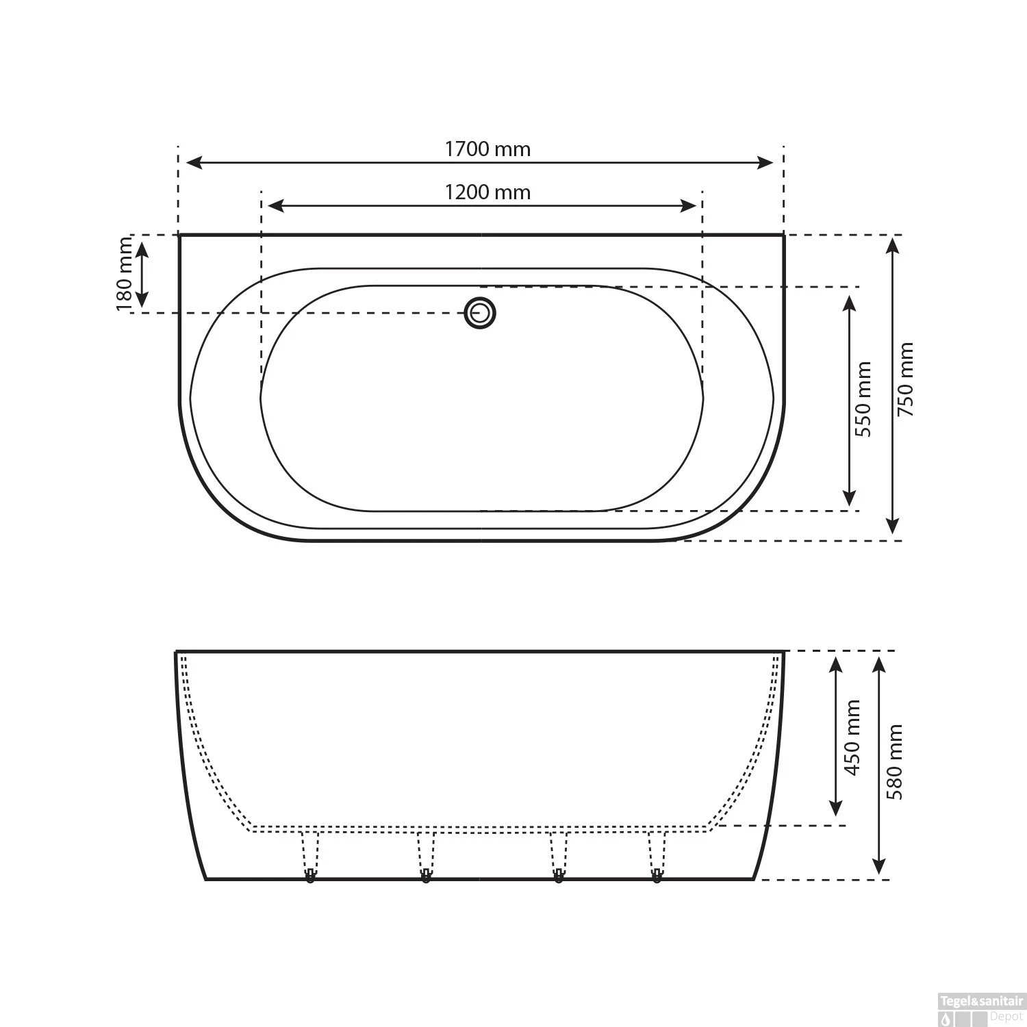 Het ligbad is afgewerkt in een hoogglans witte kleur en is gemaakt van acryl. De lengte van het bad bedraagt 170 cm, de breedte 75 cm en de diepte 58 cm. Het afvoergat kent een diameter van 52 mm. Verder is het bad uitgerust met verstelbare poten voor een stabiele ondersteuning.