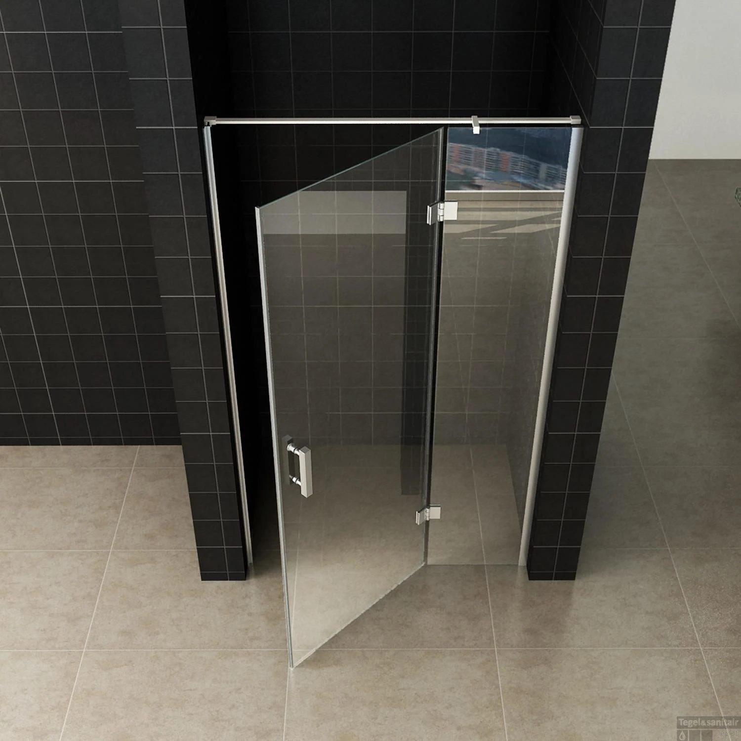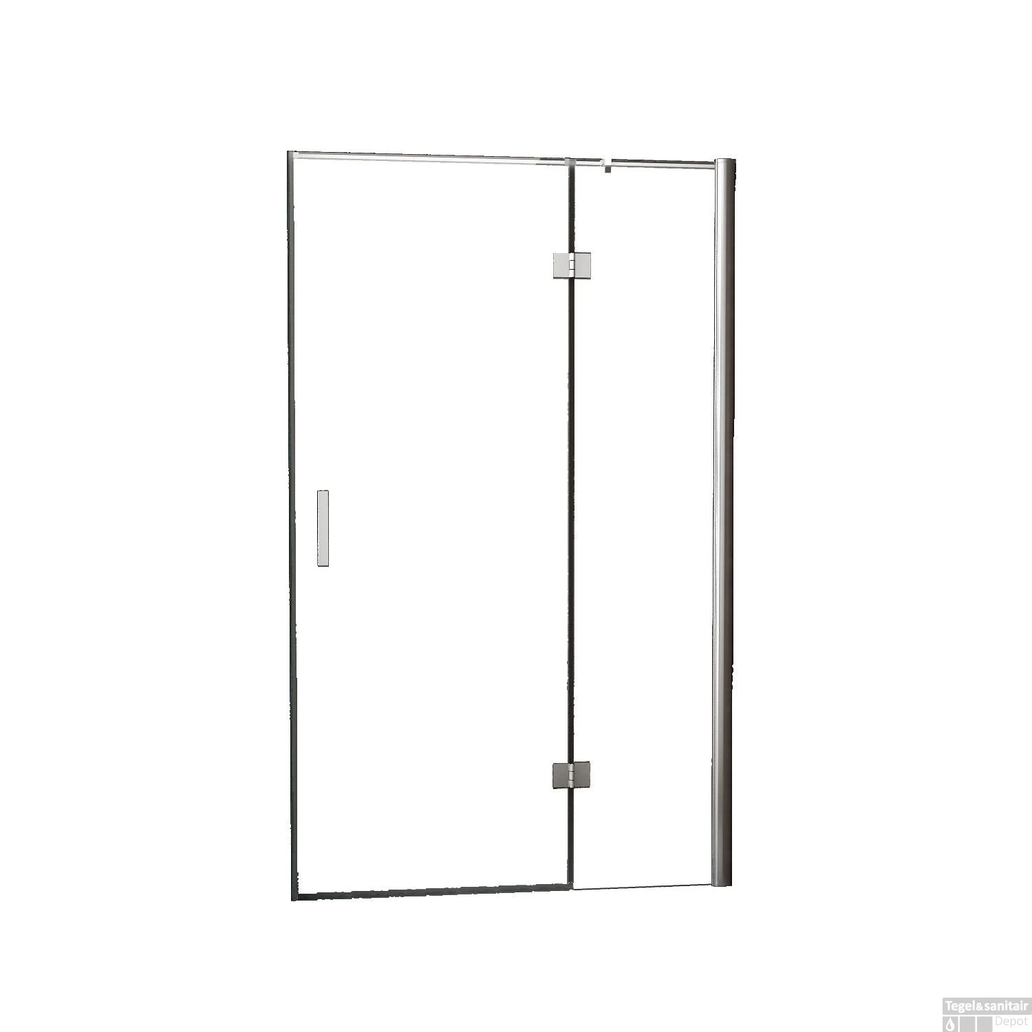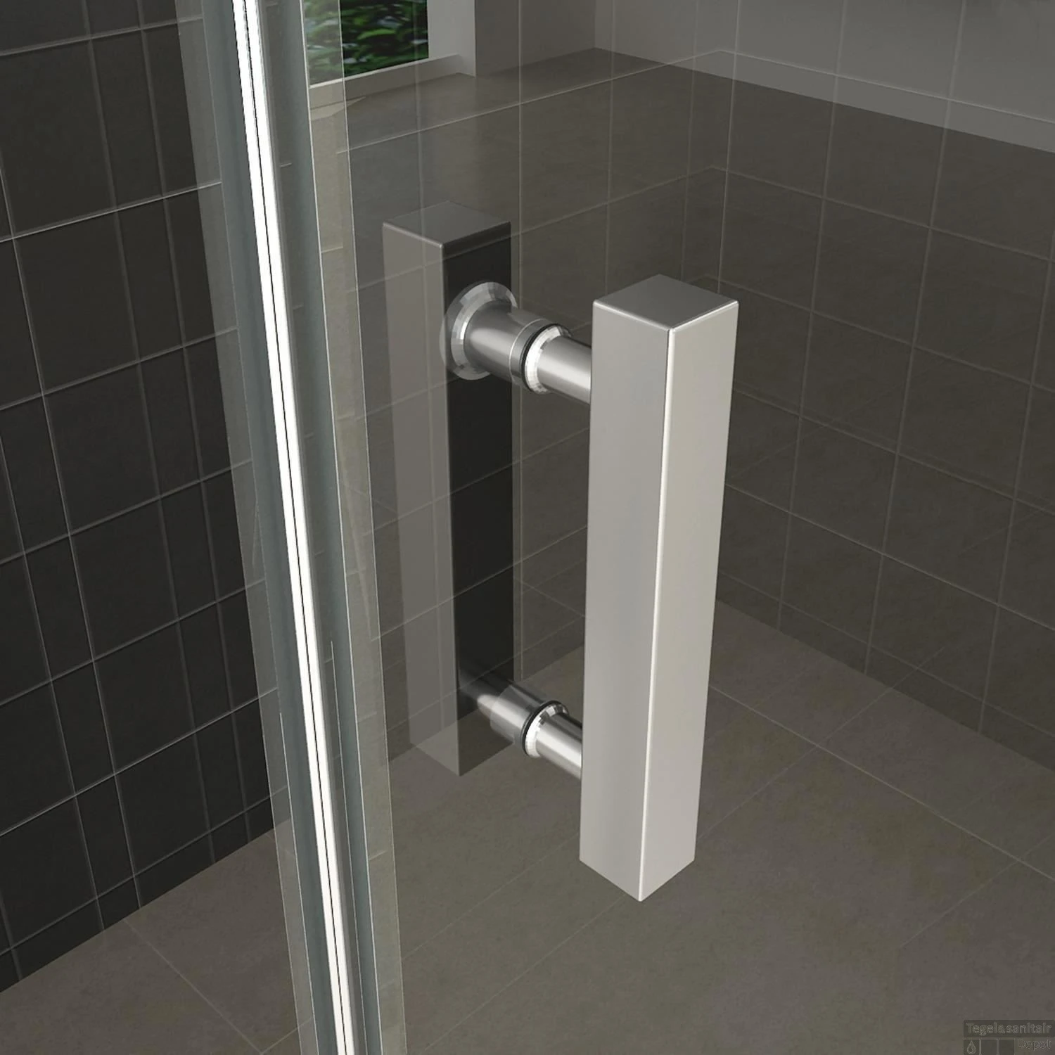 Een ideale oplossing voor een grote doucheruimte! Losse deuren zijn vaak te smal om uw doucheruimte af te sluiten van wand tot wand. Met het vaste paneel (20 cm) van de Nis swingdeur hoeft u zich er geen zorgen over te maken. De deur is voorzien van een mooie handgreep en de deur wordt met twee mooie aluminium grepen verbonden aan het vaste paneel.