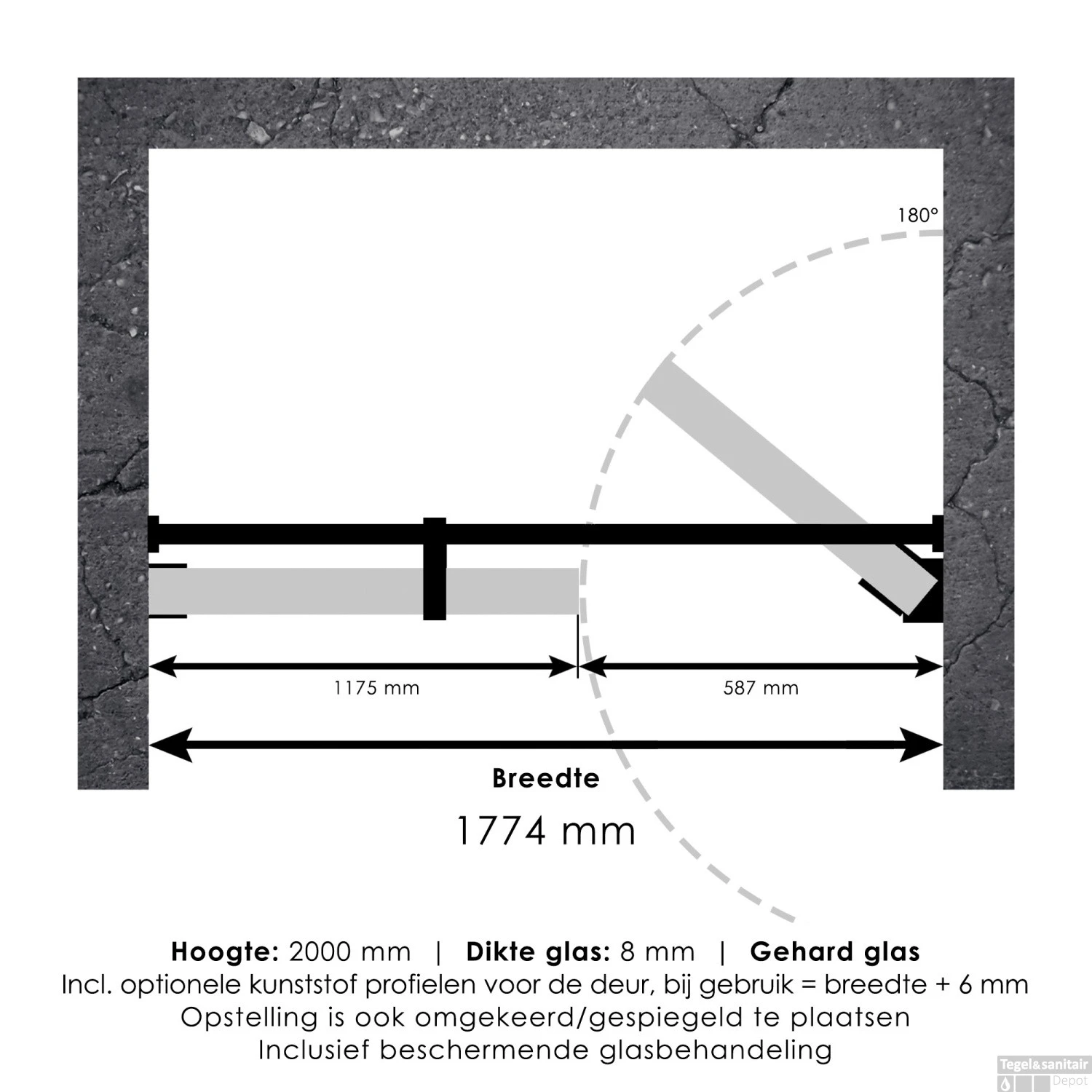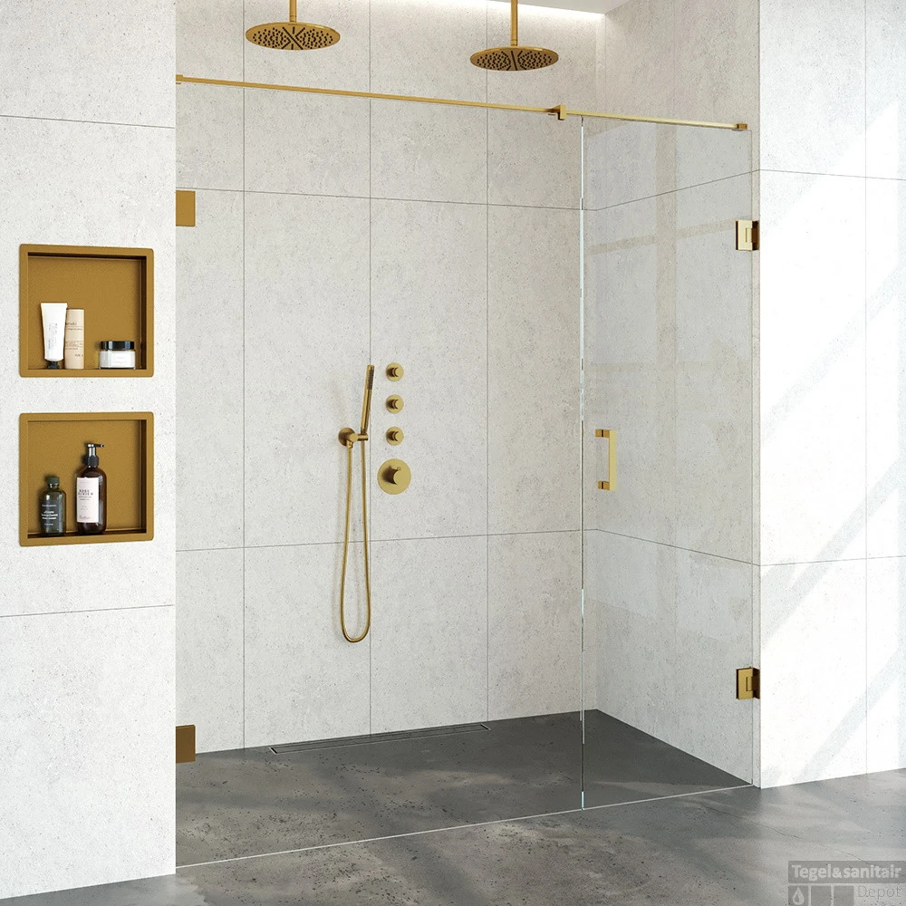 Deze complete nisdeur bestaat uit een inloopwand en draaideur met goud beslag. Inclusief glasbehandeling en optionele kunststof profielen. De hoogte is 200 cm. Deze nisdeur straalt luxe uit door zijn design en kleur.
