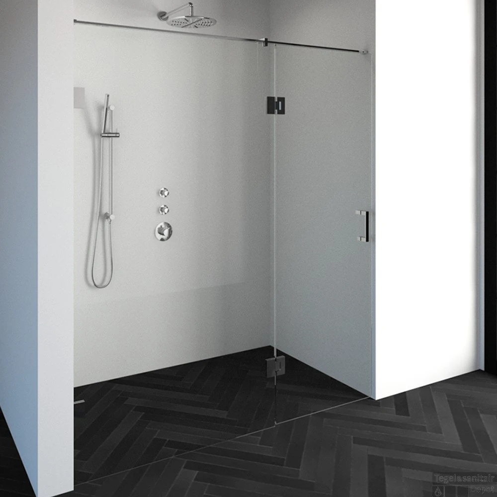 Deze complete nisdeur bestaat uit een inloopwand en draaideur met Chroom beslag. Inclusief glasbehandeling en optionele kunststof profielen. De hoogte is 200 cm. Deze nisdeur straalt luxe uit door zijn design en kleur. De draaideur wordt met een glasscharnier bevestigd op de inloopwand.