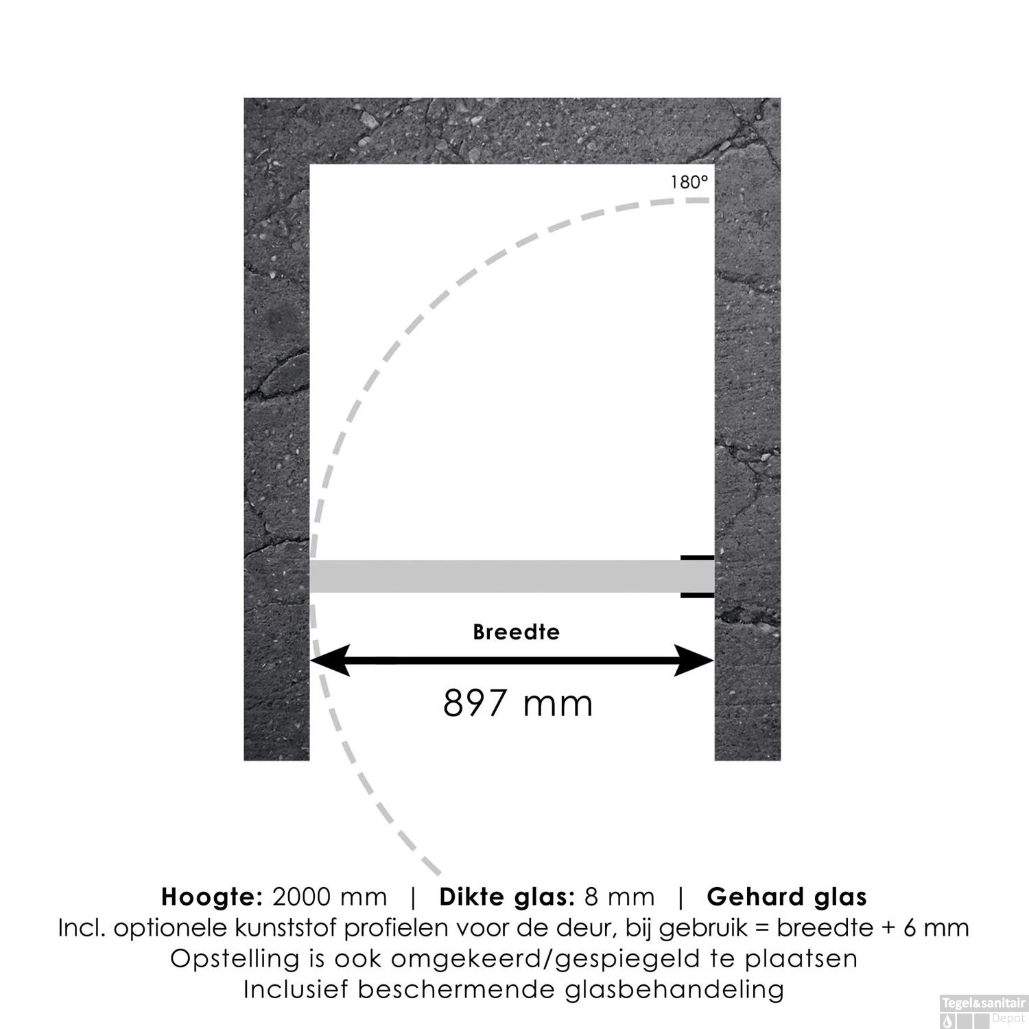 Deze complete nisdeur bestaat uit een draaideur met RVS beslag. Inclusief glasbehandeling en optionele kunststof profielen. De hoogte is 200 cm. Deze nisdeur straalt luxe uit door zijn design en kleur.