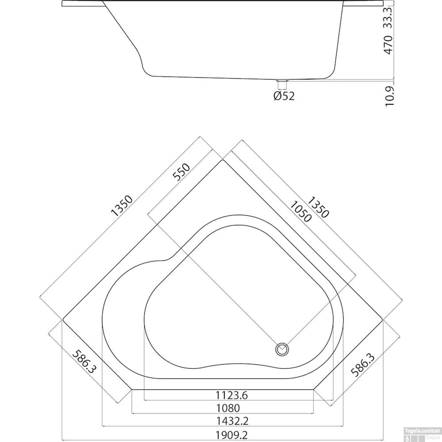 Specificaties Ligbad Optimo Hoekbad 135×135 cm Wit