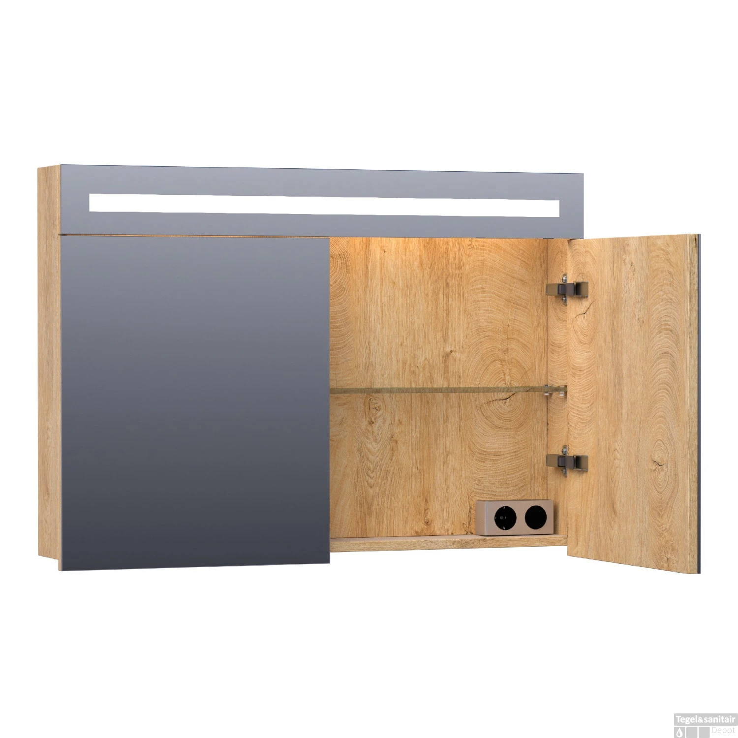 De kast bevat een enkelzijdige spiegel en een mooie houten look aan de binnenzijde. Verder wordt de spiegelkast inclusief een ingebouwde stopcontact geleverd.