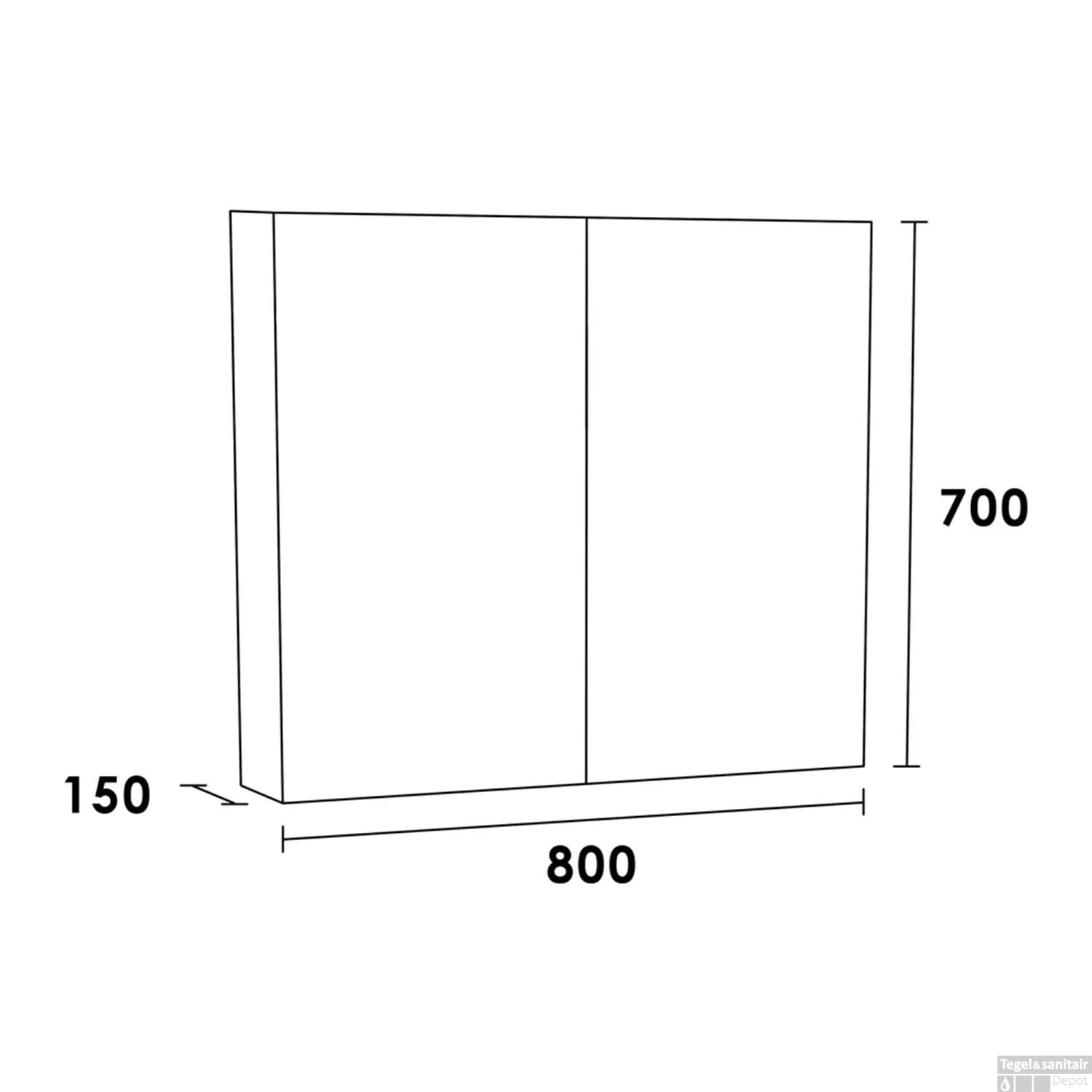 De spiegelkast is 80cm breed, 70 cm hoog en 15 cm diep.