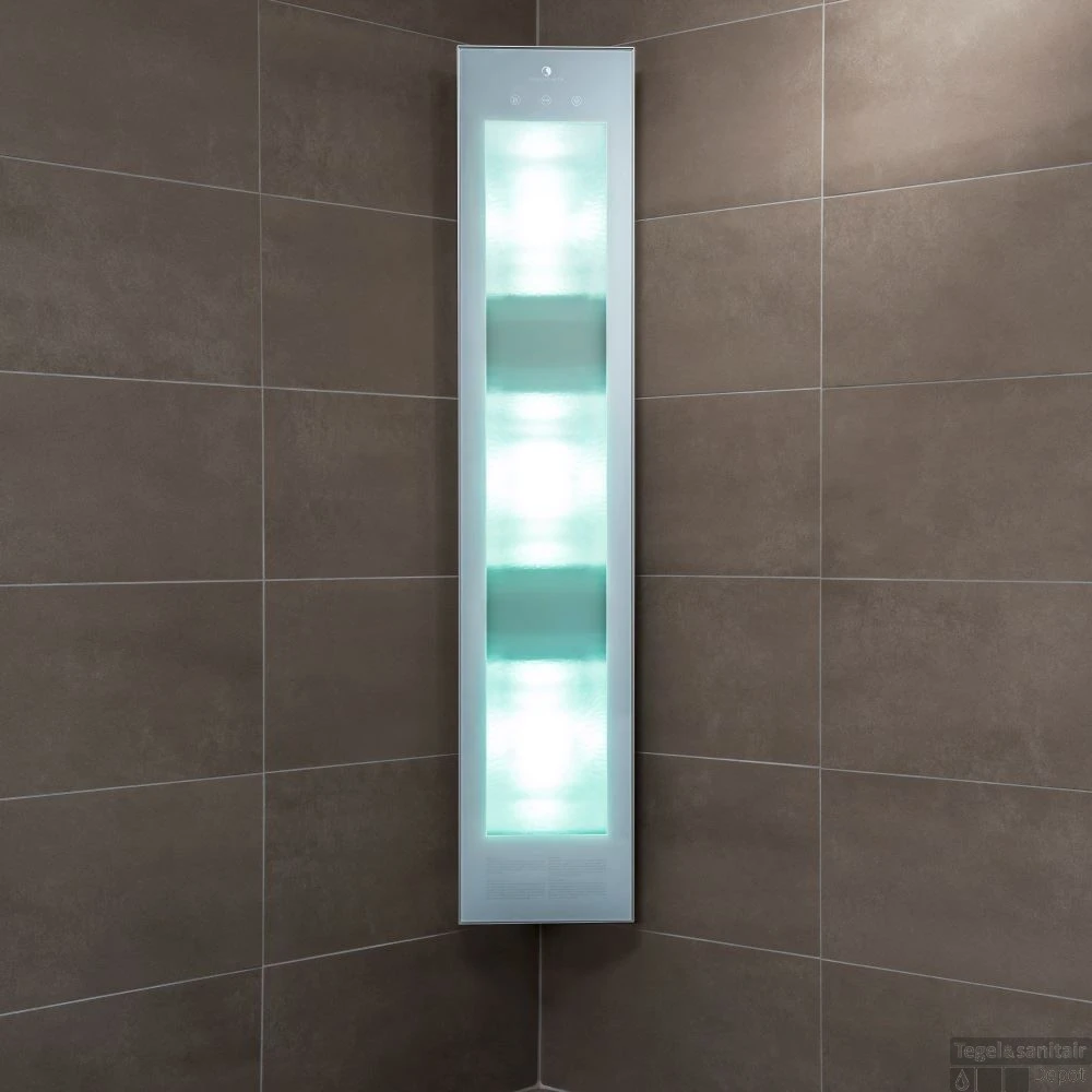 De Sunshower Combi White is een full body opbouwapparaat voor in de hoek, met zowel een UV- als infraroodfunctie. De Sunshower Combi White heeft vier korte golf infraroodlampen van elk 500W en drie UV-lampen. Het apparaat is dubbel geïsoleerde, afgewerkt met een gezandstraalde glasplaat met een wit kader en heeft een smalle opstaande aluminium rand.