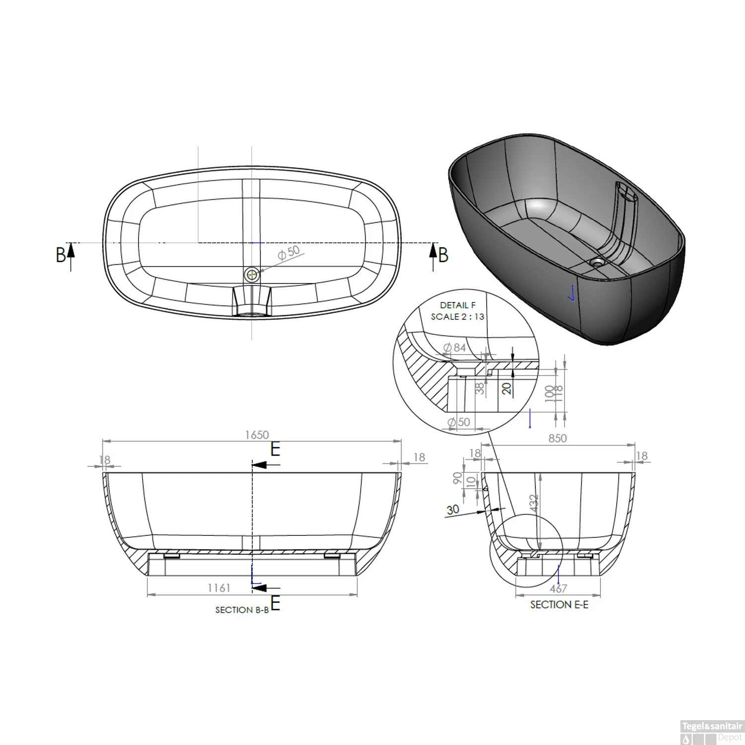 Dit bad is in totaal 57 cm hoog, maar de zitdiepte van het bad is 43.2 cm. Het bad is 85 cm breed en heeft wanden van 1.8 cm dik. De poten zijn geïntegreerd in het bad. Hierdoor hoeft u geen aparte potenset aan te schaffen.