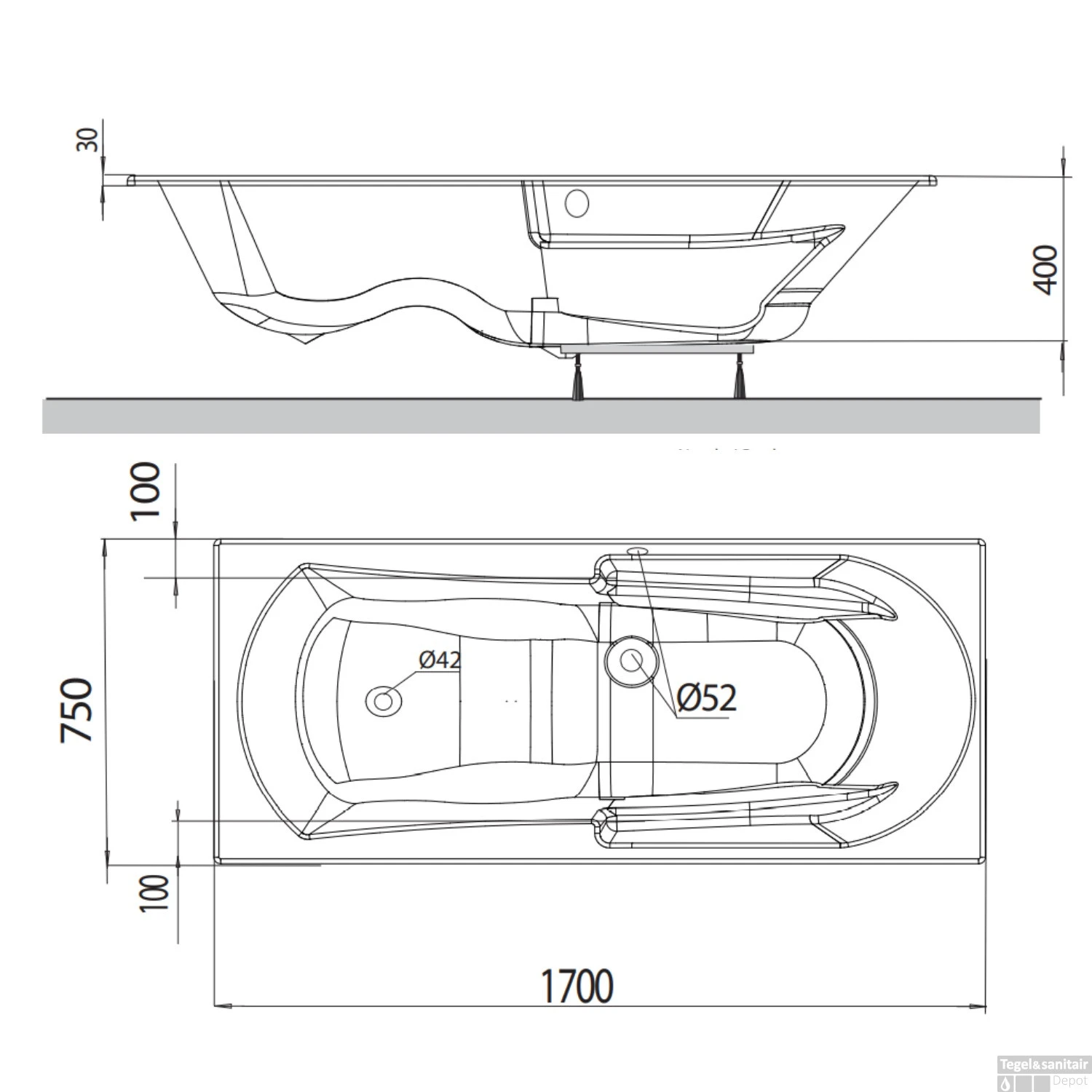 De afvoer van dit bad zit in het midden van de bodem, en wordt zonder afvoergarnituur geleverd. Het bad heeft een zitdiepte van 40 cm, een lengte van 170 cm en een breedte van 75 cm. Bij dit bad krijgt u verstelbare poten die ervoor zorgen dat het bad op zijn hoogst 53 cm hoog is. De inhoud van dit bad is 100 tot 170 Liter.