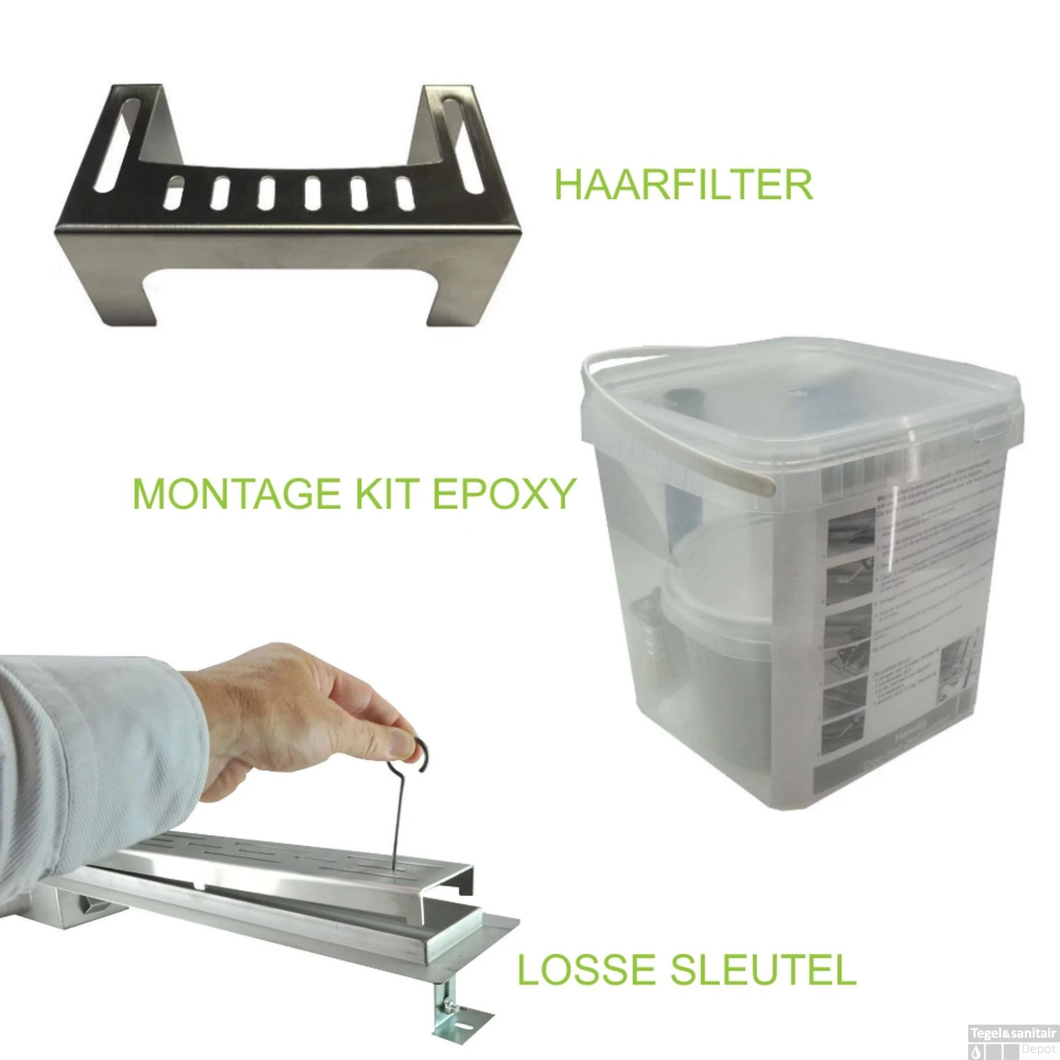 Bij de 70cm lange douchegoot wordt standaard een tegelrooster meegeleverd. Daarnaast is het mogelijk om de douchegoot met tegelrooster uit te breiden met onderdelen voor het optimaal kunnen gebruiken van uw nieuwe douchegoot.