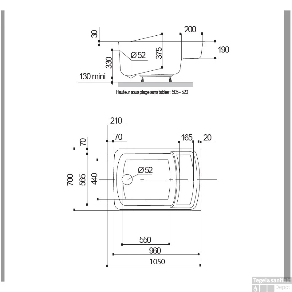 Het bad wordt standaard geleverd met pootjes en is ABS-versterkt. De afmetingen van het zitbad zijn Lengte: 105 cm de Breedte 70 cm de Hoogte: 50,5-52 cm en de Diepte: 37,5.
